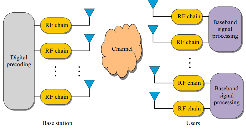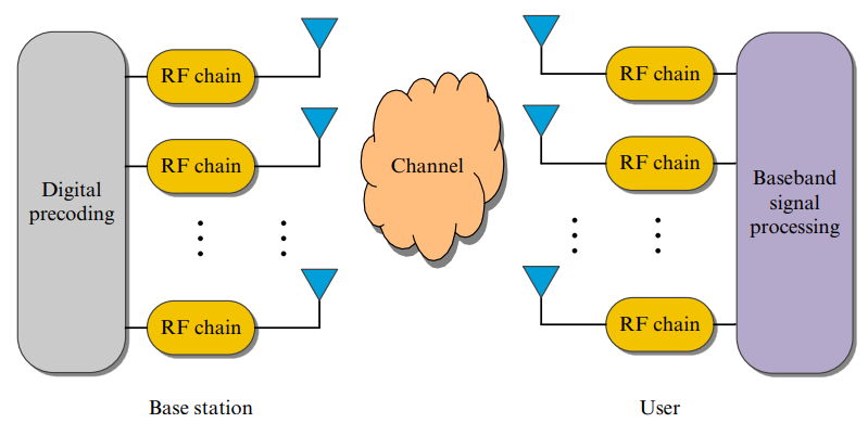 Here in fig. 6.1, BS uses Nt antennas and receiver employs Nr antennas. Transmitter can transmit at maximum Nr data streams to receiver simultaneously, where Nr < Nt. As a result, the number of simultaneous data streams transmitted is equal to the number of antennas on the receiver. Using its Nt RF chains, BS implements a Nt X Nr digital precoder D. Each antenna elements requires its own RF chain.