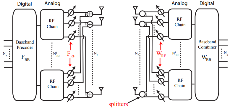 Here in above figure hybrid precoder is subdivided into analog precoder equipped with larger antenna array and relatively small baseband or digital precoder to cancel interference between simultaneous multiple data stream available in MIMO communication system between Tx & Rx due to spatial multiplexing compatibility.