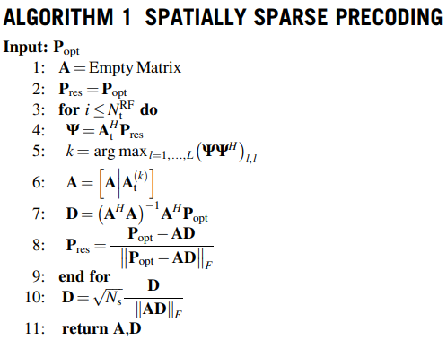 In the above algorithm, we get vector At(ϕlt , θl t ) which is transmission array vector along with Popt (which is basically unitary ‘V’ matrix in SVD (appendix B)) has maximal projection in step 5. At(ϕlt , θl t ) also indicates antenna array vector at transmitter with a azimuth and elevation angle of departure. Here in Step 6, the chosen column vector At(ϕlt , θl t ) is applied to the analogue beamformer A. Step 7 involves deciding the dominant vector as well as D's least-squares (LS) solution. ‘D’ indicates digital precoder. The chosen vector's input is then omitted in Step 8, and the method must begin detecting the column along which the Pres (Residual precoding) matrix has the highest projection before all Nt RF precoding vectors have been selected (Mumtaz, 2016).