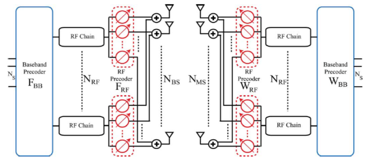 Fig 2: Architecture of transceiver at Tx & Rx both which contains RF chains and baseband beamformers (Alkhateeb, 2014)
