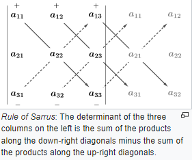 det(A) = a11*a22*a33 + a12*a23*a31 + a13*a21*a32 – a31*a22*a13 – a32*a23*a11 – a33*a21*a12