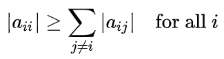 Verify that the magnitude of the diagonal item in each row of the matrix is greater than or equal to the sum of the magnitudes of all other (non-diagonal) values in that row so that