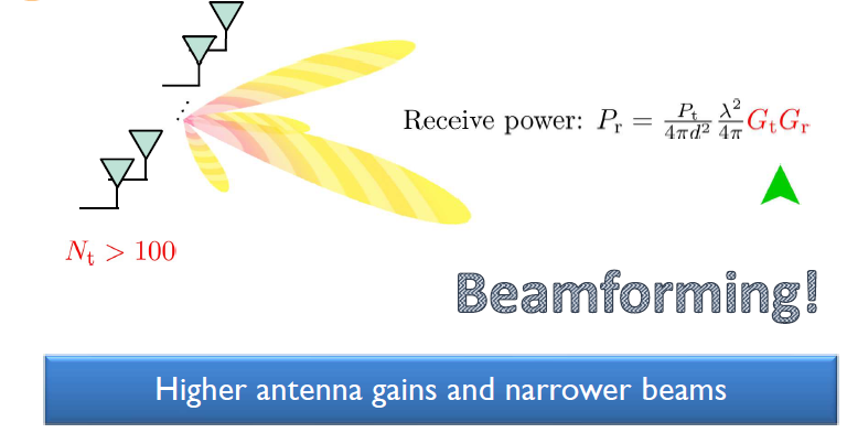 Because of small wavelength, it suffers from huge path loss. Massive MIMO beamforming is required to combat high path loss as shorter wavelength allows Compact antenna arrays in a small region. More antenna elements in a small region gives more beamforming gain. In figure 1.1, it is shown closely spaced antenna elements are forming beam in a particular direction. Usually antenna elements are spaced in half-wavelength interval to avoid unwanted sidelobes and to focus stronger signal in a particular direction.