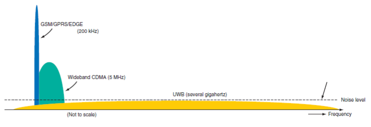 Fig 8.2: UWB signal bandwidth compared to conventional and spread spectrum signal bandwidth (Frenzel, 2007).
